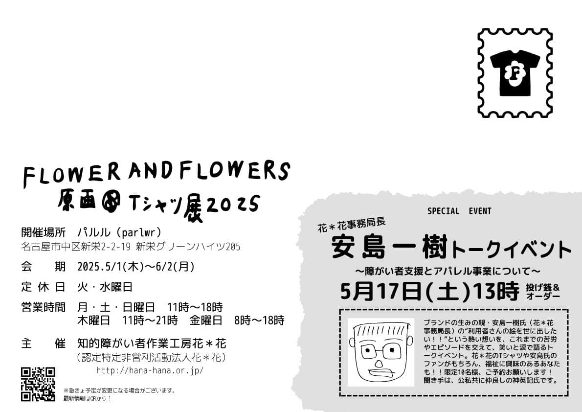 障害者のアート活動に造詣の深い、神英記さんをゲストにお呼びして花*花事務局長の安島一樹さんのトークショーを期間中に行います。