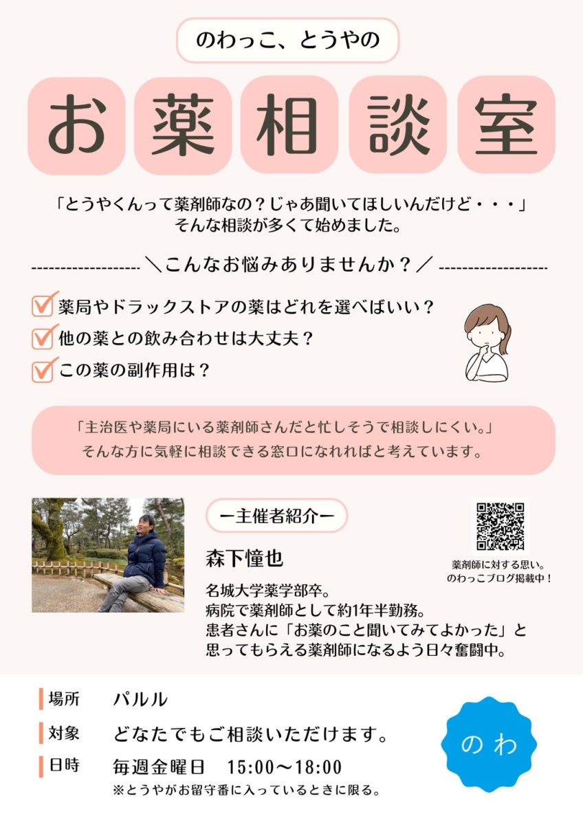 薬は今や、薬局やドラッグストアだけでなく、インターネットやコンビニでも購入できる時代になりました。こうした場所では、薬剤師や登録販売者が対応し、薬について説明を受けることができます。私がパルルで「薬剤師の資格を持っています」と話すと、「薬のことを教えてほしい」と声をかけられることがあります。そうやって頼ってもらえることに嬉しさを感じる一方で、現場にいる薬剤師や登録販売者の説明だけでは、薬を安心して使えていない人がいるという現実にも気づかされました。その状況をほんの少しでも解消しよう。そんな思いでお薬相談室を始めることにしました。お薬の事、どんな些細なことでも気軽に聞いてみてください。待ってます。