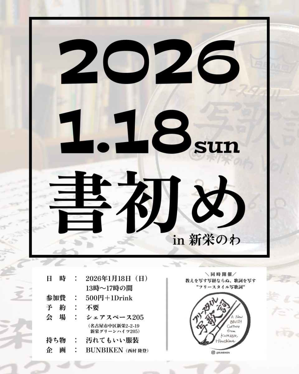 \のわのシェアスペース205オープンデーに合わせて実施!/ 書初め in 新栄のわ 年明け1発目、1月18日(日)205オープンデーに合わせて、「書初め」を実施します。 普通に書いてもよし、凝ったデザインや文字にしてもよ […]