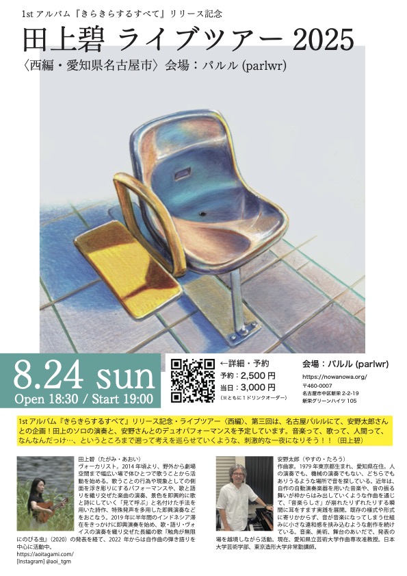 2025年8月24日(日) 出演 田上碧 w/安野太郎(Performance) 会場 パルル(parlwr) 開演 19:00(開場18:30) 料金 予約 2,500円/当日 3,000円(+1ドリンクオーダー) 予 […] |